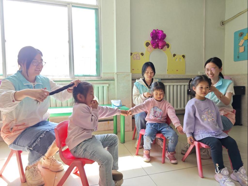 幼儿园午休结束后,三位女大学生温柔地给小朋友梳头,纤细的手指灵活穿梭,将发丝梳理得整齐顺滑,小朋友乖巧地坐着,脸上洋溢着幸福。