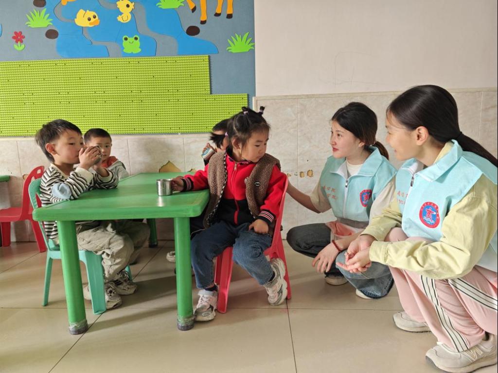 在自由活动时间,女大学生们和小朋友们在一起交流聊天。她们认真倾听小朋友们分享他们的小秘密、小趣事,还会和小朋友们分享他们的校园生活,增进了解,拉近与小朋友们的距离。