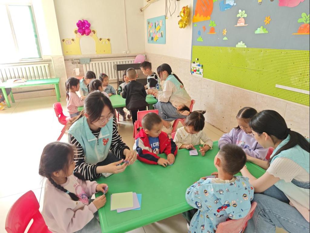 手工折纸环节更是创意满满。彩纸在女大学生和小朋友们手中翻转,不一会儿,千纸鹤、小船等造型各异的作品诞生。小朋友们眼睛亮晶晶,自豪地展示成果。