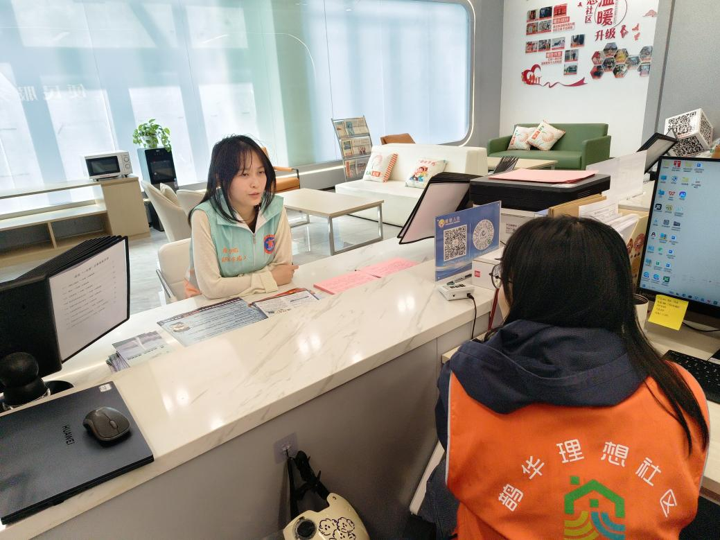 图为:实践成员李婧姝与工作人员沟通社区情况