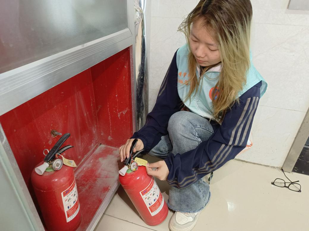 鹊华理想社区3号楼内,两名实践成员正跟随物业人员逐层排查消防隐患。实践成员手持压力检测仪核对灭火器有效期,经检测发现线路老化后,维修人员当场更换配件,实践成员同步将全楼27个消防栓检查情况录入社区智慧管理系统。