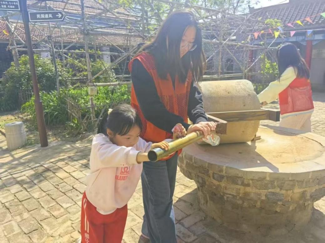 实践团成员给小朋友讲解石磨的历史、原理及用途,帮助小朋友了解石墨是怎样将小麦磨成面粉,并与小朋友一起体验推磨。