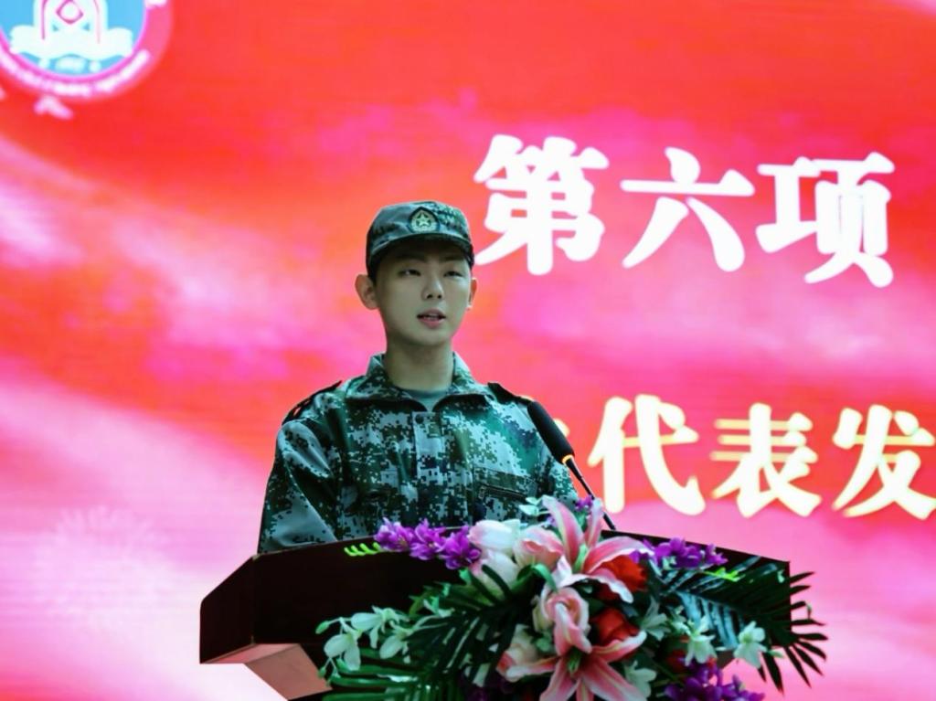 本科网络与新媒体2501班张冠霖作为新生代表在发言中表达了成为一名“英才学子”的激动心情。他庄严承诺,将以抗战先辈和现代军人为榜样,在军训期间严守纪律、挑战自我、团结协作,以实际行动践行“自强不息、与时俱进”的校训精神,努力以优异的训练成绩,为大学生涯递交第一份合格的答卷。