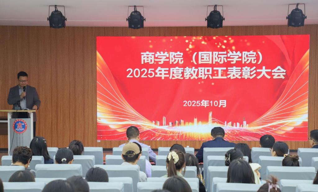 为表彰先进、树立典型,激励全体教职工凝心聚力、再创佳绩,2025年10月14日下午,商学院(国际学院)在学术报告厅300举行2025年度教职工表彰大会。本次大会由赵坤院长主持,学院领导、获奖教师及全体教职工齐聚一堂,共同见证这一荣誉时刻。