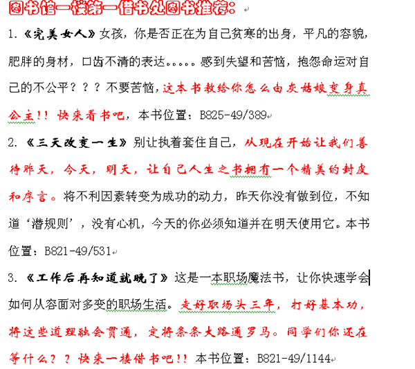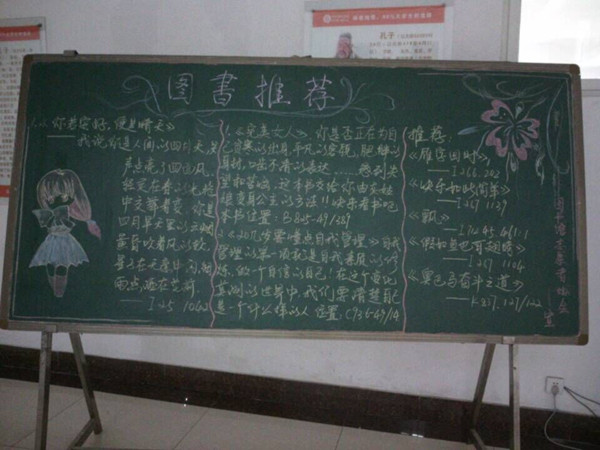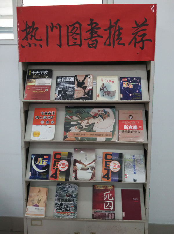 首先,志愿者在借书处分别挑选具有代表性的图书,制成精美推介文档,张贴在校园人口密集处,如宿舍、食堂等;其次,制作“图书推荐”精美黑板报,放在图书馆大厅,并定期更新图书推荐内容;另外,每个借书处都设有“热门图书推荐”专架,随着图书推荐宣传力度的加大,前来借阅推荐图书的同学也络绎不绝。