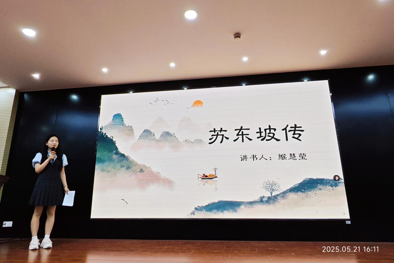 缑慧莹同学手执林语堂先生英文写就的《苏东坡传》翩然登台,这部由林语堂先生以英文写就的文学传记横空出世于1947年,四卷二十八章,翰墨生香,勾勒出千古文豪的精神图谱。缑慧莹同学以"文坛北斗"为脉络,将苏轼在诗词文书画等领域的卓绝成就娓娓道来。分享尾声,她如数家珍般呈现东坡居士的珠玑文字:从"十年生死两茫茫"的深情演绎,"诗酒趁年华"的豪情万丈,到"黄州惠州儋州"的豁达胸襟,三重意境层层递进。带领听众穿越千年触摸不朽的文魂。