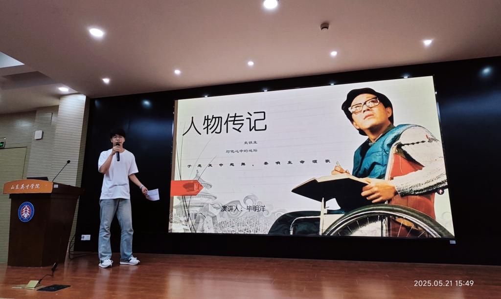 毕明洋同学给大家分享了《史铁生人物传记》,以“史铁生与他心中的地坛”为精神坐标,围绕“于悲风中起舞,奏响生命颂歌”展开叙述。在层层递进的阐述中,通过史铁生与病痛抗争的创作历程,展现了作家如何在轮椅桎梏下用文字丈量生命厚度。尾声处,毕明洋同学以震颤人心的声线诵读史铁生箴言:宇宙以其不息的欲望将一个歌舞炼为永恒,这欲望有怎样一个人间的姓名大可忽略不计。余音绕梁间,让永恒的生命颂歌在听众心中久久回响。