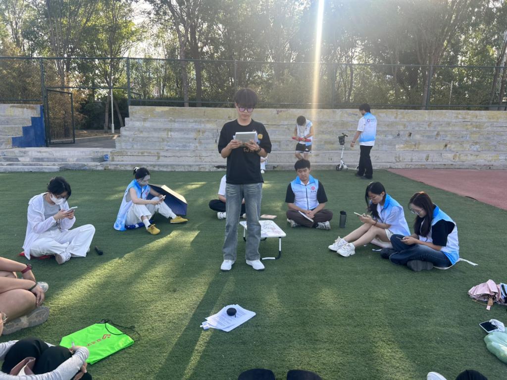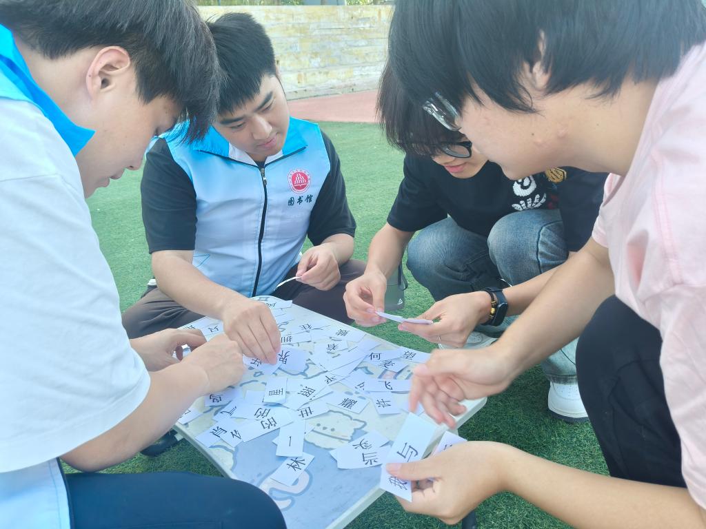 夕阳西下,主持人以清亮的嗓音唤醒现场:"让我们暂别电子屏幕的荧光,在油墨芬芳里寻找诗意的栖居。"绿意盎然的操场上,师生们相聚一起,掌纹间还留着教室桌椅的木质余温。随着"书名接龙"的轻快鼓点敲响,同学们围坐成圈,依次接龙书名,现场气氛迅速升温。从《活着》到《界线》,再到《线》……一个个书名串联起同学们脑海中的“藏书阁”。接龙“卡壳”的同学大方起身,介绍自己并分享近期在读的书籍名称。欢声笑语中,大家不仅认识了新朋友,还收获了一份长长的趣味书单。