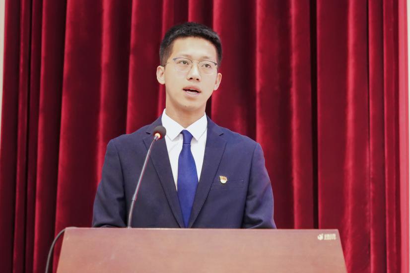 新任会长李国栋发言,他认为朗诵与主持协会对学生发展有着重要作用,未来将从推广普通话、展现汉语魅力、传承国学经典三方面着手开展工作。