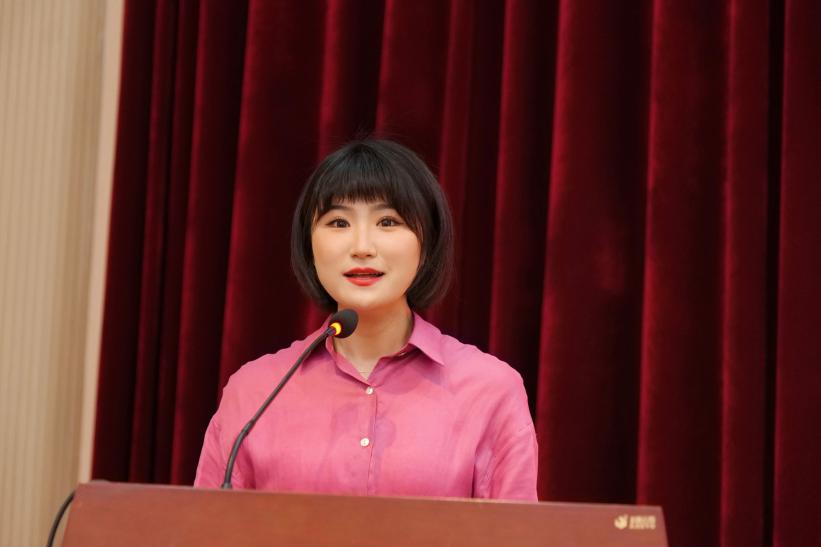 朗诵协会指导老师杨晨以饱满的热情及面貌在会上致辞。她对协会成员长期以来的工作做出肯定及鼓励,用精简的“热爱”二字概括师生们对朗诵与主持协会的精神内涵。她提出“没有最好,只有更好”将是本协会行动指南,要加快发展成为更具特色、更具创新性的学生社团。
