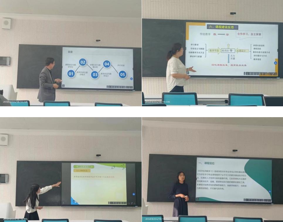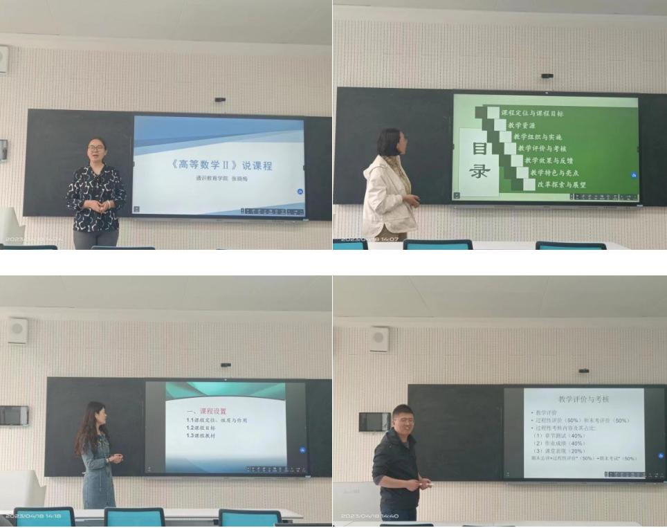 说课交流会上,数学教研室全体教师,从“说课程”的七条标准出发,围绕课程定位与课程目标、教学资源、教学组织与实施、教学评价与考核、教学效果与反馈、教学特色与亮点、下一步改革探索与展望等展开具体阐述,结合自己的教授课程以及工作心得进行了经验的分享与讨论。全体数学教研室教师纷纷表示在今后的工作中,将思政融入课堂,采用多种教学手段与教学评价相结合的方法,提高学生的学习的积极性与创新能力。