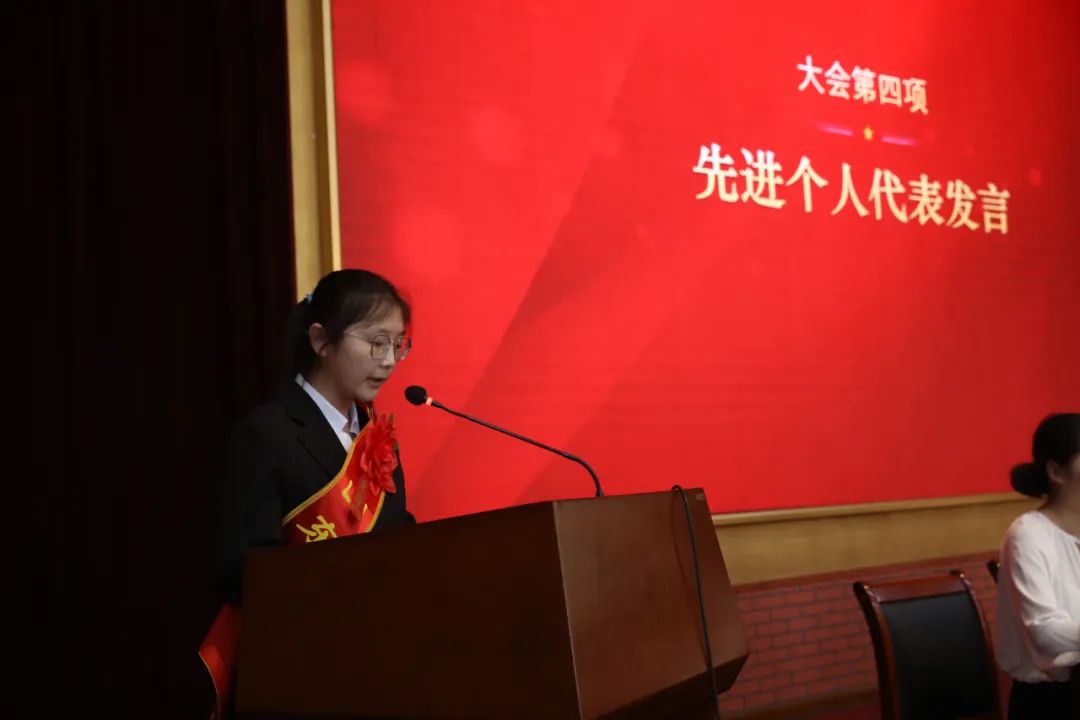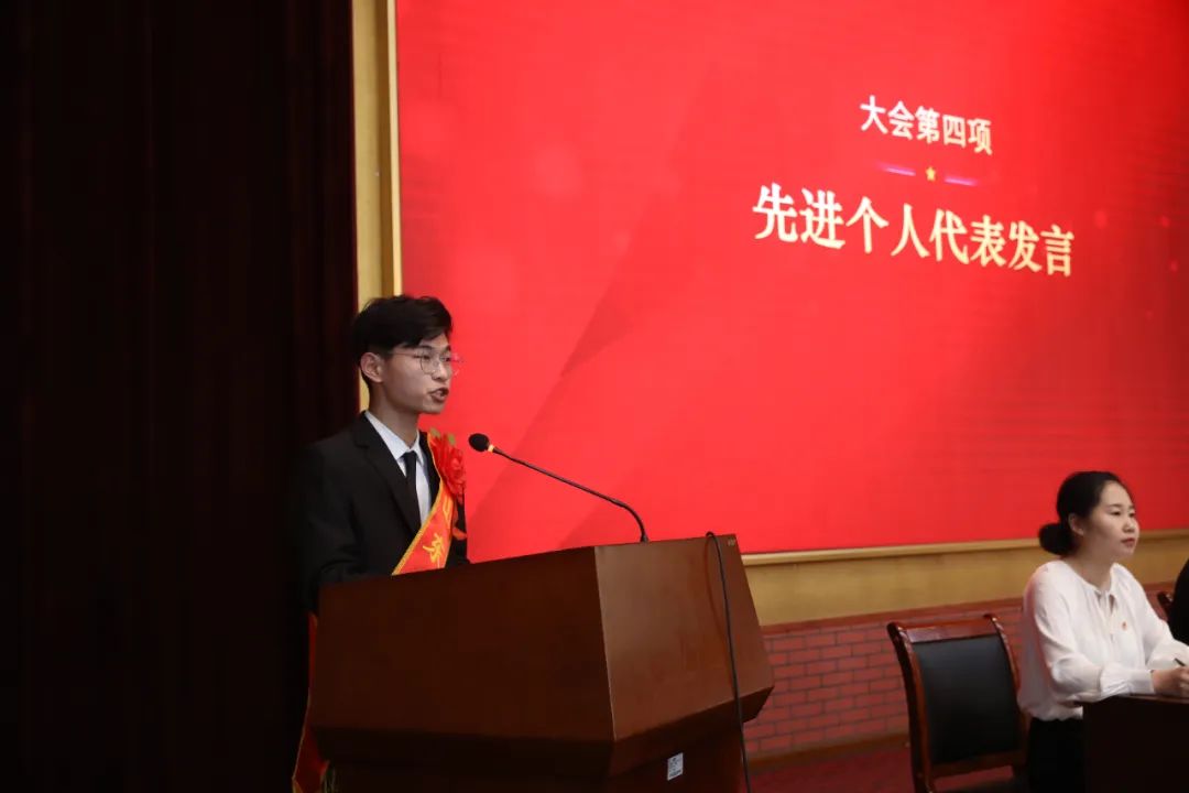 刘振雄代表学生组织志愿者发言,他介绍自学校疫情防控开启以来,英才青年迅速成立抗疫突击队,一个个“红马甲”组成了核酸检测的引导向标,展现了勇于承担、无私奉献的精神。许多同学积极请战报名到党员示范岗和青年先锋岗,担当起青年抗疫责任。校学生会团结各校级学生组织、二级学院学生会用最美的“志愿红”共同筑起疫情防控坚实的“长城”。同时,他回忆自己在志愿服务过程中也遇到过困难,也想过要放弃,是身边领导、老师、同学们的感人事迹激励他坚持了下来。他表示同学们作为新时代青年,同时身为志愿者,要向先进典型学习,不怕苦、不怕累,用实际行动践行“请党放心、强国有我”的青春誓言,努力成为有理想、敢担当、能吃苦、肯奋斗的新时代好青年团队。