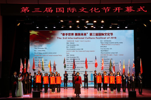 开幕式由外国语学院的学子表演的舞蹈串烧点燃了全场的激情,拉开了序幕。开幕式进行的第一项是各国家代表入场,国家代表们举着各国的国旗呈倒八字列队陆续登场,与此同时仪式进入了第二项,主持人介绍第三届国际文化节的内容,主要有外文歌曲大赛、外语角、英语风采大赛、中外学子大联欢、英文手抄报展览、大型英文话剧、模拟联合国、英文短句大赛、闭幕汇报演出暨元旦晚会等。接着仪式进行了第三项,张维娜院长上台致开幕词,提出了国际文化节是外国语学院文化重要组成部分,已经成为了外国语学院的活动品牌,不仅能突出专业特色、发挥同学们在校园文化建设中的作用,也成为外语实践教学不可或缺的组成部分;并希望同学们在这个舞台上尽情演绎,放大自己的亮点,显示自己的才艺和风范。张维娜院长表达了对本次活动深深地期望以及对外国语学院优秀学生们的厚望。然后仪式进入了第四项外教 Vanita 就英语的重要性和教育的重要性发表了讲话,同学们受益颇多,对英文对学习有了更深刻的了解和更为重视的态度。然后出席此次开幕式的领导为本次国际文化节揭幕并合影留念。最后有四位同学分别用中文、粤语、日语和英语带来的串烧歌曲为第三届国际文化节开幕式落下圆满的帷幕。