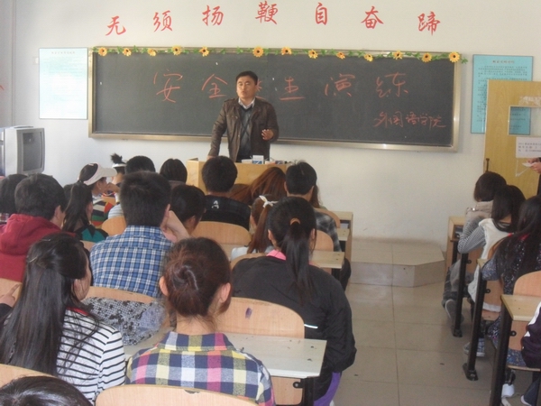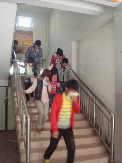 首先由外国语学院行政副院长孙志峰做了动员,讲述了演练流程及注意事项,并且提出了要求,希望所有同学认真、严肃、对待本次活动,严格按要求进行。演练开始,当启动信号想起后,在辅导员老师及保卫处特勤队学生地组织下,同学们迅速有序地从教室跑出,每人用毛巾捂住嘴巴,弯腰,按规定地顺序逃出教学楼到达指定地点集合,自然站成队伍,由学生会成员清点人数。