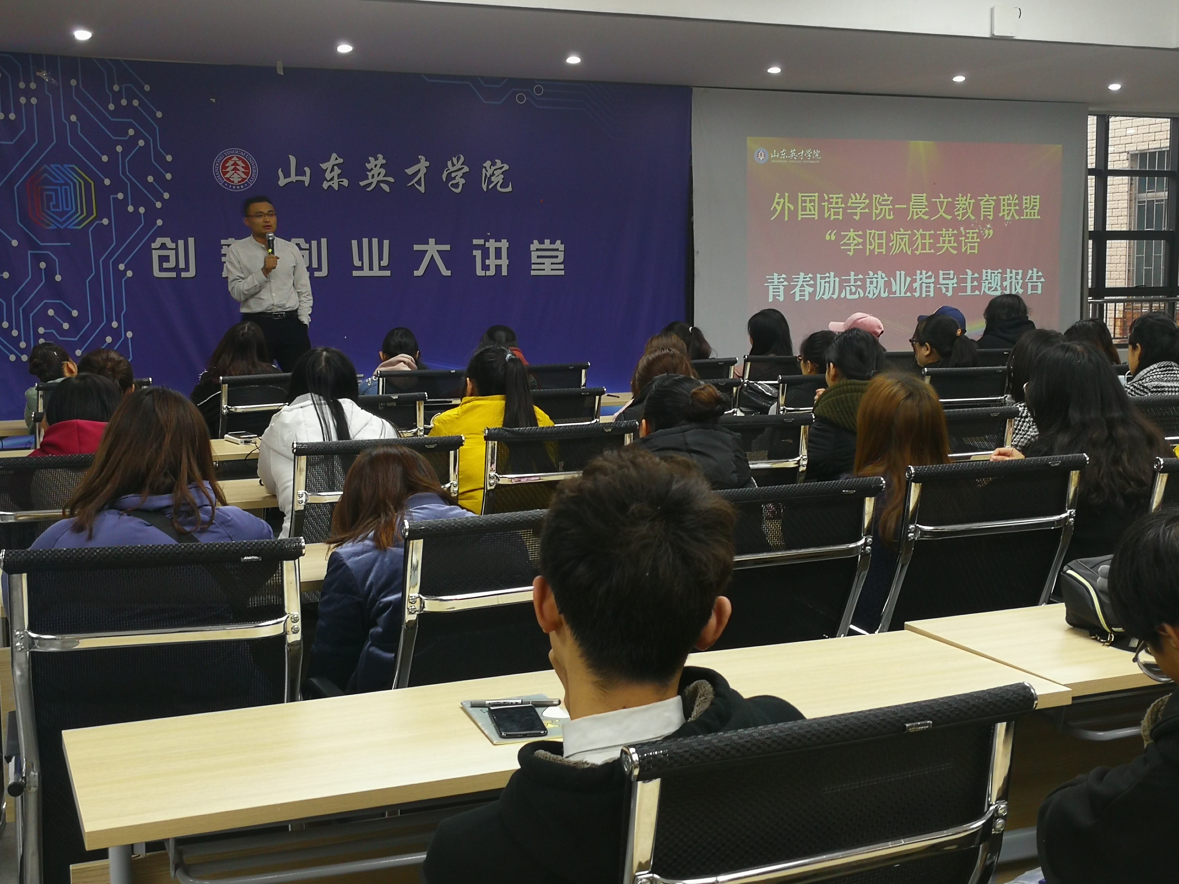 2018年11月15日,晨文教育联盟潘亚童校长、“李阳疯狂英语”华北区教学总监、2008北京奥运会英语教练高圣旭校长为外国语学院学生开展“奋斗的青春最美丽”青春励志就业指导主题报告。报告会由外国语行政副院长曲永存主持。2016/2017普通本科以及2017级应用本科学生参加。