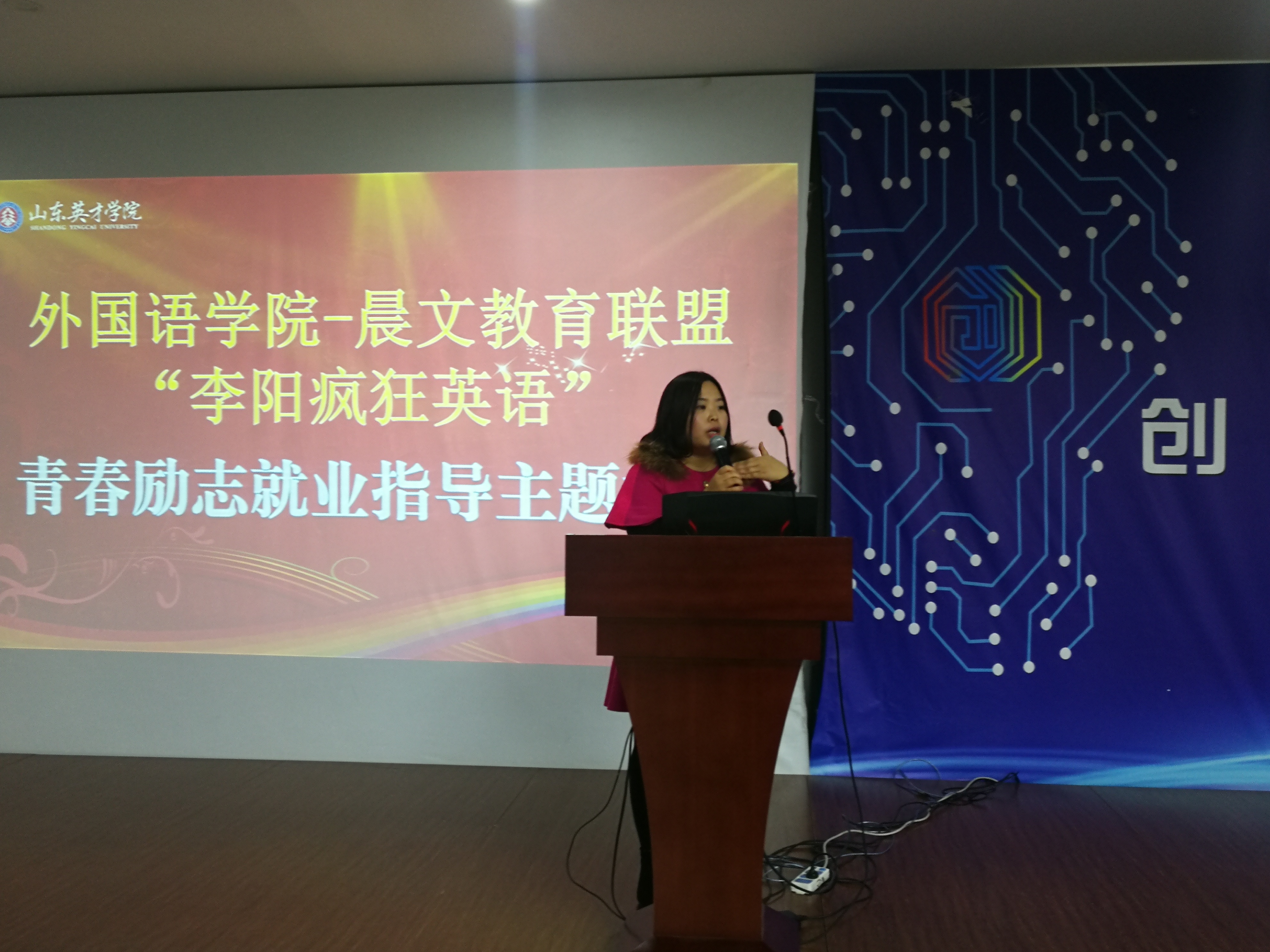“李阳疯狂英语”高圣旭老师用幽默风趣的口吻,穿插着英文,结合自身经历为同学们带来了大学生活如何度过、先就业、再职业、最后创业的成功经验。让同学们在欢笑中收获英语职业人的学习经历、成长经历,树立了正确的职业生涯规划。感悟人生、收获人生。在讲座的最后阶段,高圣旭校长为在座的学生展示了一段“疯狂英语”,结尾You can't have any ability, but you can't have no confidence and courage.让学生信心倍增。