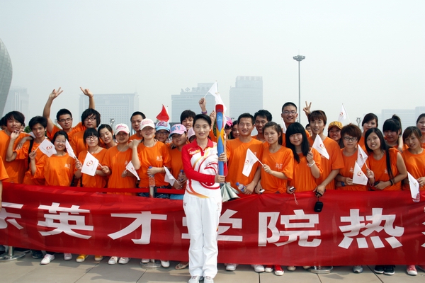 不到八点,英才学院的方阵就已经整齐的站在了指定区域,同学们身着统一服装,精神饱满,意气风发,手里挥舞着国旗和亚沙会会旗,高喊着“魅力英才 快乐亚沙”的口号,在现场掀起了一阵高潮,迎来了现场媒体和火炬手的关注。火炬手胡蕾说,英才学院的同学们体现了当代大学生快乐、积极、向上的精神风貌,并与同学们合影留念。一位来自河南的学生说:“很荣幸能参加亚沙会火炬传递,作为一名大学生,在现场感受到了亚沙会快乐。”另一名来自海阳的学生说:“亚沙会就在我们海阳举行,今天在济南参加亚沙会火炬传递,心情特别激动,也特别有意义。祝愿亚沙会成功举办,希望亚沙会能把快乐带给更多的人。”
