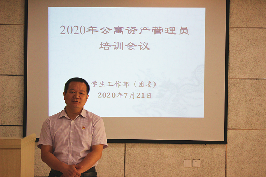 为适应学校资产管理需要,夯实学生公寓资产管理责任,确保学生公寓资产的有序、有效管理。于2020年7月21日9:30在大学生心理咨询中心会议室举行学生公寓资产管理员培训会。梁庆文院长、资产与实验室建设管理处姜磊处长、学生工作部龙新良部长、学生工作部杜春茂副部长、公寓科全体工作人员以及全体公寓主任出席本次培训会。会议由学生工作部杜春茂副部长主持。