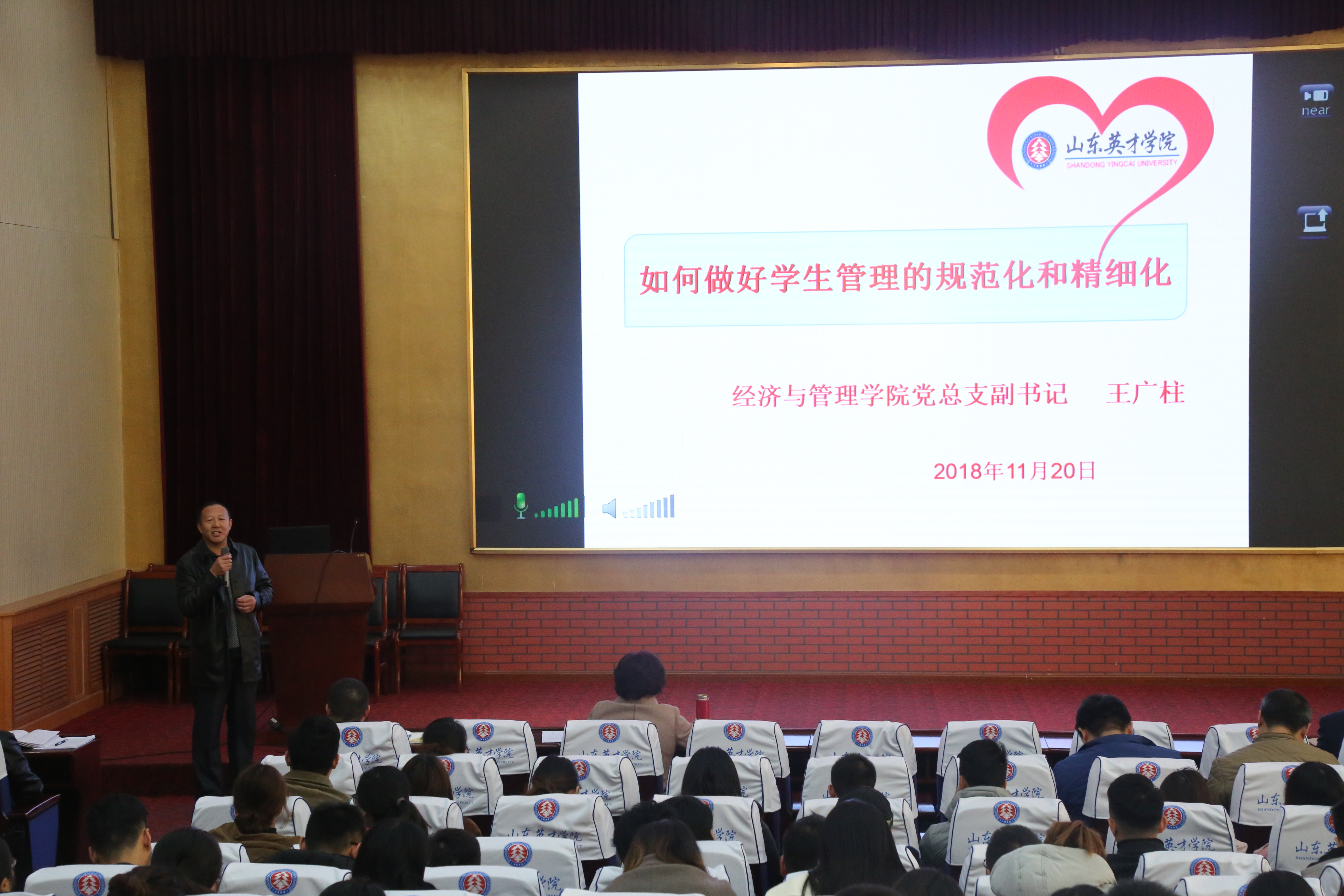 会议第三项由二级学院党总专职书记交流学生教育管理工作经验。孔祥泉书记以“打造学风工程,创新教育管理做法和体会”为题,引导辅导员做学生的教育者、引领者、管理者着力打造学风工程创新教育管理。杨庆年书记以“辅导员 “三化”建设永远在路上”为题,通过讲述自己管理学生中的一件件处理解决的事例使广大辅导员一个更加直观的学习印象。并从“辅”“导”“员”三字的内涵、职责一一做了讲述。王广柱副书记以“如何做好学生管理的规范化和精细化?”为题,从精细化管理的意义、内容及方法,告诉广大学生工作无小事,只有真诚服务、爱生奉献,才能做好学生管理工作!王君副书记通过讲述分析辅导员在大学生心理危机干预中的定位,提高了辅导员在日常管理工作中对异常心理现象的把握度, 能够及时关注到心理异常学生的动态,确保了学生的安全稳定。