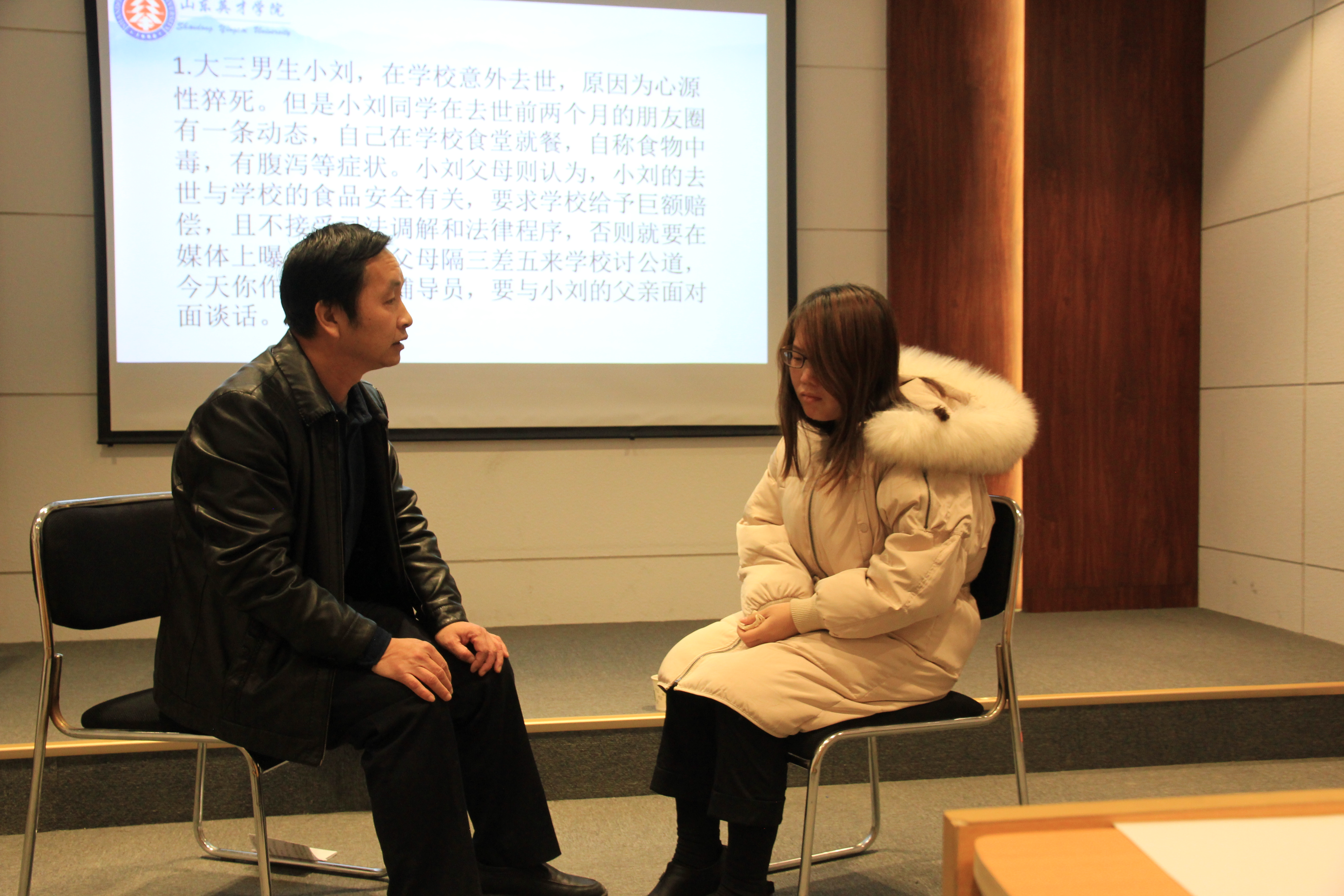 谈心谈话环节,参赛辅导员现场抽题,在6分钟的时间内通过情景再现的方式,体现辅导员在实际工作过程中对相关政策、学生特征、学生成长成才规律的了解把握及对问题的解决能力和对学生的教育引导能力。外国语学院党总支书记曲永存,信息工程学院辅导员田芝图老师和经济管理学院姜召伟老师在模拟现场学生的配合下,面对学生工作中的突发事件和常规问题,能够迅速稳定学生情绪,切中问题要害,体现了辅导员专家化,职业化的素养。