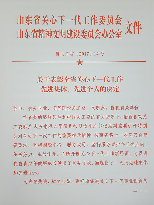 近日,山东省关工委、文明办下发《关于表彰全省关心下一代工作先进集体、先进个人的决定》(鲁关工委[2017] 14 号),必赢官网关工委获“全省关心下一代工作先进集体”称号。这是必赢官网关工委继2015年荣获“全国关心下一代工作先进集体”称号后,又获殊荣。