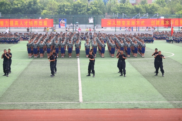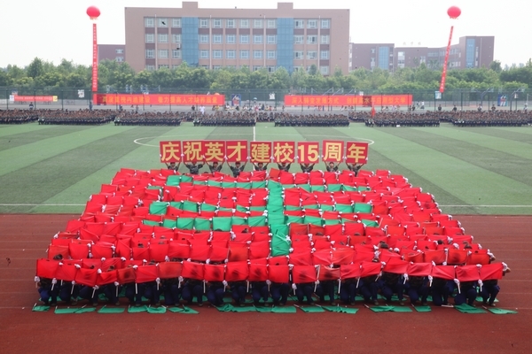 紧接其后,分列式开始,全体师生起立,共同瞻仰2010年9月21日曾在天安门广场高高飘扬的中华人民共和国国旗,在场师生行注目礼,当国旗到达主席台前时,全场爆发出热烈掌声,以此表达对祖国的热爱。由经济管理学院、艺术学院、文法、园林学院为单位组成的9个分列式方队整齐划一、口号嘹亮、步伐矫健的依次从主席台前走过,个个精神抖擞,气宇轩昂。分列式结束后新生方队进行了4项课目汇报表演,分别为刺杀操表演,刺杀是近战歼敌的重要手段,在反侵略战争中,有着重要的意义。今年是建军86周年,艺术学院的尖刀连方队特别摆出八一队形,向中国人民解放军致敬;内务展示表演,“相亲相爱是一家,公寓文明靠大家。”公寓是大学生的第二课堂:宿舍就是我们的家。宿舍内务整理是当代大学生行为习惯养成的一个很重要的方面。经过为期15天的军训锻炼,使得新生们第一次远离家乡能够独立高效的完成内务整理,学会自我成长;旗语操表演,以舒展娴熟,简洁流畅的优美动作,一丝不苟的形象,意气风发的英姿,充分展现新一代大学生勇于拼搏,开拓创新,积极进取的求学精神;军体拳表演,主要用于强身健体,近身护卫以及演习表演。军体拳表演方队,拳拳生威,踢腿凌厉有势,斗志昂扬,个个势如霹雳。其间,军体拳表演方队中用队员身体展示的 “英才树”校徽图案,意喻英才学院“十年树木,百年树人”,体现教育行业特性及应用型人才培养观念。英才树最前方是由五个英文字母组成的“ycno1”字样,意为“英才永第一”;旗语操表演方队用旗子组成“庆祝英才建校15周年”字样,教官每喊一个字,队员展示一个图案,口号队形呼应默契,搏得在场师生阵阵雷击般掌声,将展示环节推向了高潮。