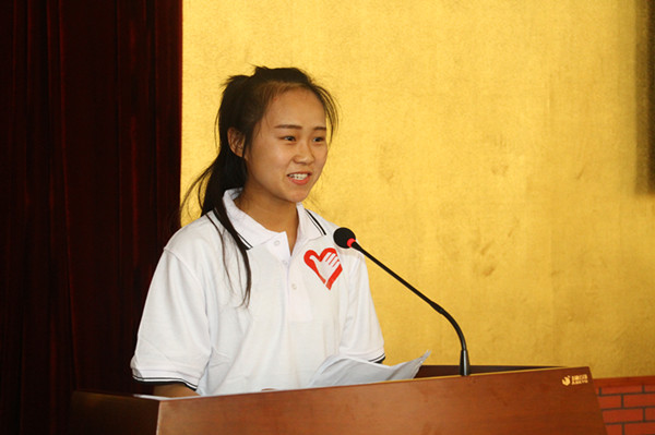 学生代表刘珊珊慷慨激昂的发言触动了在场的学弟学妹的心。她励志参加志愿活动服务,并向老师同学保证,一定不辜负大家的期望。