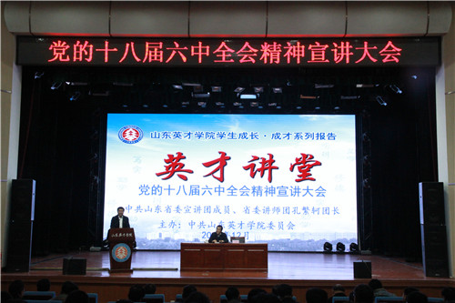为深入学习贯彻党的十八届六中全会精神,开创全面治党新局面,根据学院党委工作计划和学生思想政治教育实施方案,2016年12月5日下午,在南校区大学生活动中心,必赢官网特别邀请中共山东省委宣讲团成员、省委讲师团孔繁轲团长进行了专题讲座。党委副书记、副校长张宗胜,校党委委员、中层干部(党员)、教职工(党员)、学生党员,各二级学院行政副院长、基层团委书记、全体辅导员,入党积极分子、南校区部分学生代表参与了此次专题讲座活动。
