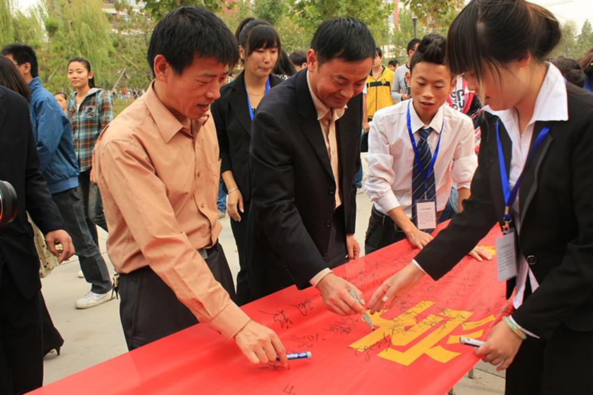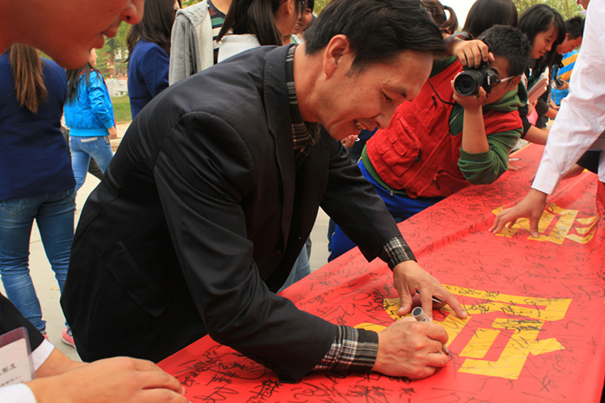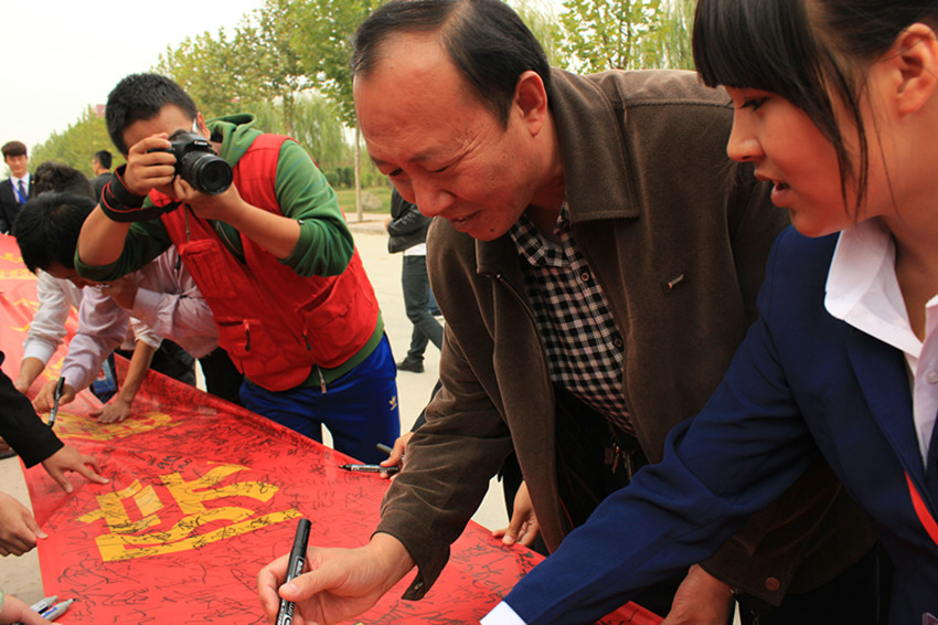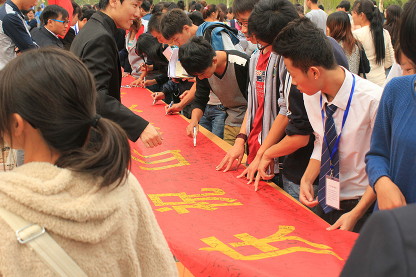 为了此次活动大学生自律会特意做了一条长15米的横幅,代表着必赢bwin线路检测中心15年的艰辛历程。11点15分活动正式开始,同学们积极踊跃的在横幅上签上自己的名字,为必赢bwin线路检测中心建校15周年送上了祝福。