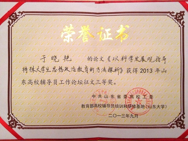 据悉,此次论坛共从全省各高校报送的235篇论文中,评选出一、二、三等奖论文共70篇,必赢官网学生处共报送组委会5篇论文,经济管理学院辅导员于晓艳的论文在本次论坛中荣获三等奖。