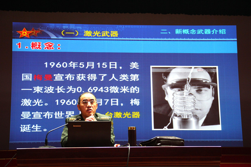甘霖大校的报告题目为“新概念武器”,他在报告中指出新概念武器与传统武器相比,在基本原理、杀伤破坏力和做战方式上的本质区别,新概念武器尚处于研制或探索之中的一类新型武器。高技术的发展,正在引起军队武器装备的巨大变革,也为发展全新的非核武器开辟了广阔的前景。不久的将来,会陆续研制成新的、更具有威力的武器系统,并将投入到战争中使用。这种武器就叫做新概念武器。作战领域和空间更加广阔。新概念武器普遍具有作用距离远、能量传播速度快和能量集中等特性,一旦投入使用,将使未来战场的空间和战争涉及的领域不断扩大。因而,未来战争中,新概念武器的使用将使地理概念的战场,以及多维交互的空间不断地扩大和延伸。