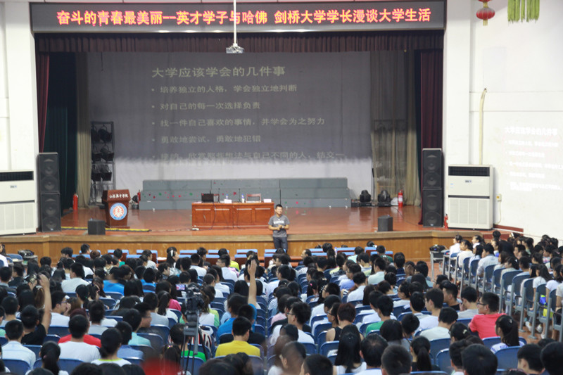 新生入学教育是大学生进入高校的第一课,也是引导和帮助新生尽快融入大学生活,尽快完成从高中生向大学生的转化的重要一课。为了做好新生入学教育工作,学工部牵头组织了“英才讲堂”新生入学教育系列报告活动。8月30日,由学工部牵头举行的“奋斗的青春最美丽――2014新生入学教育嘉年华之英才学子与哈佛、剑桥学长漫谈大学生活报告会”在南校区大学生活动中心隆重举行。本次活动荣幸邀请到剑桥大学博士夏杨、哈佛讲师张维魅力开讲。学生工作部、二级学院部分领导、老师、大一新生参加了本次报告会。