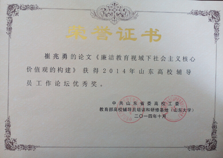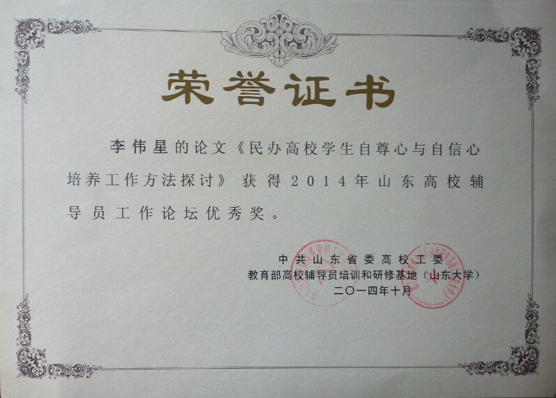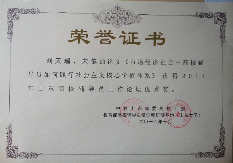 王莉宣读了《中共山东省委高校工委关于2014年山东高校辅导员工作论坛获奖论文的通报》,与会领导为获奖论文作者代表颁发了荣誉证书。