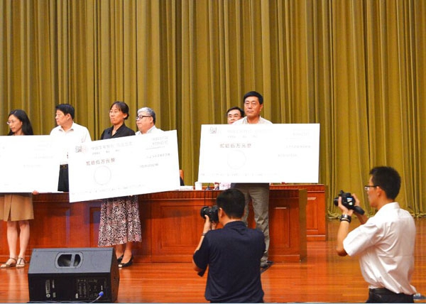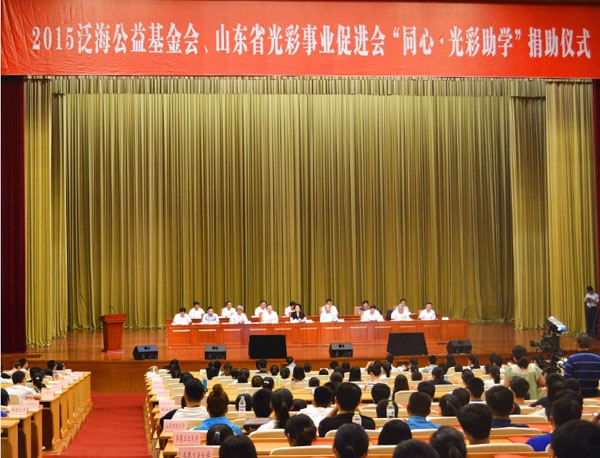 捐助仪式由省委统战部常务副部长、省光彩会副会长孙传宏主持,省委统战部副部长、省工商联党组书记、省非公有制经济组织党工委书记、省光彩会副会长孙孺声在会上宣读了《山东省委统战部、泛海公益基金会、山东省光彩事业促进会关于对姚蕊等1600名大学生进行资助的决定》。随后举行了助学金发放仪式,获得资助的学校统战部长和学生代表上台领取助学金并合影留念。山东建筑大学受助学生代表张烁龙发言,感谢党和国家、社会各界对困难大学生的支持和帮助,并表示今后要加倍努力,不断奋进,决心以优异成绩和实际行动回报社会。随后,山东中医药大学于富华书记、泛海集团卢志强董事长发表了热情洋溢的讲话,勉励大学生要奋发有为,积极进取不辜负众望,把实现中国梦和个人的梦想结合起来。最后,吴翠云部长作了重要讲话,对泛海集团和卢志强董事长支持教育事业表示感谢,并对青年学子提出了三点希望:一是坚定理想信念,努力学习回报社会;二是勤奋刻苦学习,珍惜学习机会,用勤劳的汗水实现自己的梦想;三是学会奉献社会,饮水思源,报效祖国。