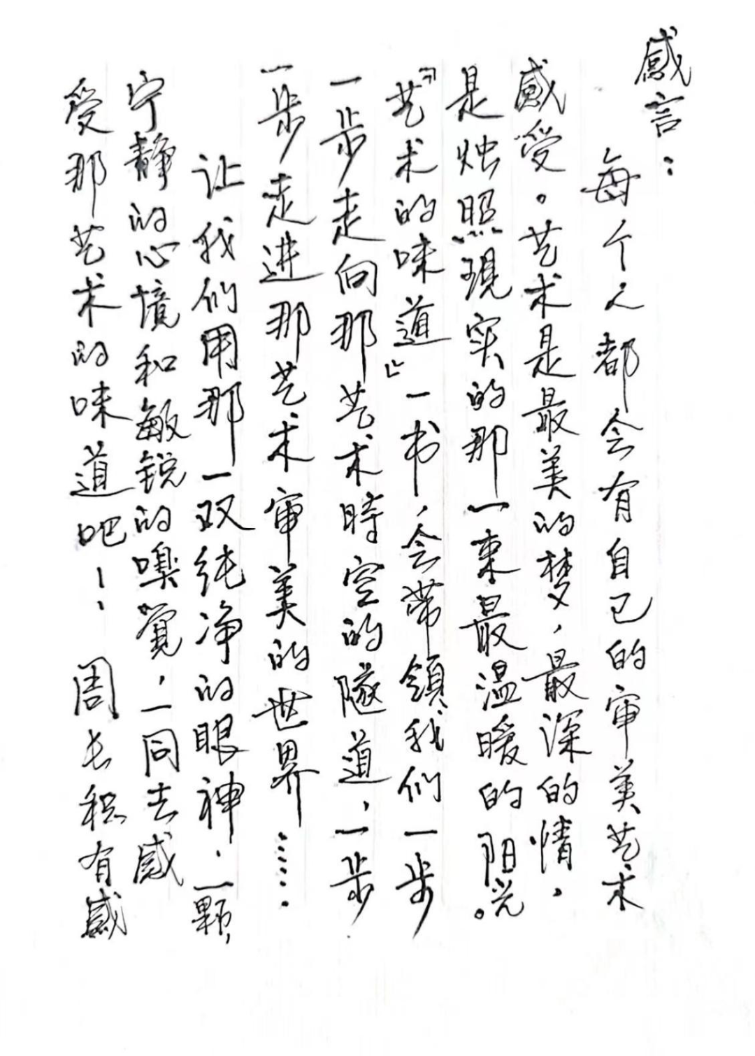 “品”是品味,品艺术的味道,其实是在品一个时代的味道,一种文化的味道,更是在品味一个美丽生命的独特味道。品味是一种寻找,寻找生命的真味,寻找生命的甘泉。《艺术的味道》中阐述了艺术的本体和表现都不是论著,而是性情。艺术是回到原点的纯粹味道,艺术从来不是为学的知识,而是为道的智慧,智慧总是回味绵长。千百年后的我们再读这些优秀的作品依旧感动,依旧震撼,依旧热泪盈眶,依旧激情飞扬,依旧能感受到他们活泼而灿烂的生命。或者品味这些作品,不能为我们提供一个放之四海皆准的人生捷径和便利方案,然而它们却能擦亮我们的眼睛,洗净我们的心灵,照亮我们的征程,穿越历史时空的隧道,走进艺术家的内在世界,让我们在他们情感起伏的波澜中,重新凝视自己、品味自己和寻找自己,慢慢发现原来我们和那些美丽的灵魂之间相隔的,绝不是千百年的岁月、绝不是千万里的河,而仅仅是一双纯净的眼,一颗清明的心。艺术是最美的梦,是最深的情,是烛照现实的那一束最温暖的冬日阳光,让我们一起去感受那艺术的味道吧!
