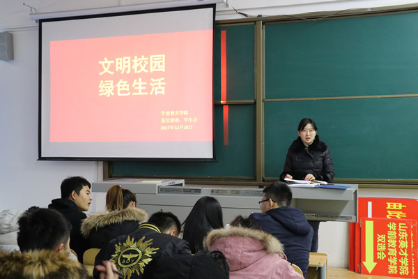 会议伊始,王书记首先向大家介绍了文明生活绿色生活的意义。紧接着,王书记又向大家列举了简单的实例向大家印证文明生活:路上相遇时的微笑,同学困难时的热情帮助,平时与人相处时的问候亲切,见到师长时的问好,不小心撞到对方时的一声“对不起”。一件件看似简单的事情却蕴含大大道理,王书记让大家更加明白文明的意义。随后,颜书记又再次强调了文明用语,讲究礼仪。懂礼貌、明事理,用文明语,做文明事,在颜书记的讲话中,同学们深受启发,在讨论中得出:应该多进行自我反省,互相理解、宽容待人的结论。最后,在同学们讨论如何建设绿色生活中,本次会议正式结束。