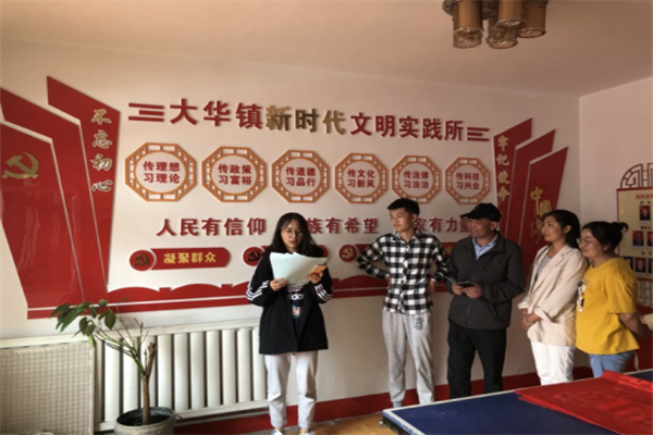 通过咨询,王纯宇同学了解到自2001年以来大华镇的经济一直在不断发展。尽管如此,村民的思想道德素质一直有待加强,对党的政策缺乏基本了解。于是,她前往大华镇人民政府,在政府工作人员的带领下,和村民共同学习新时代中国特色社会主义思想及习近平总书记关于青年工作的重要思想,贯彻党的理念,践行主流价值观的培养活动。
