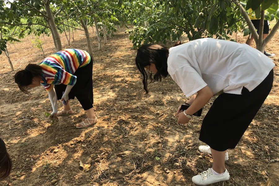 志愿者分别在核桃地地和花生地辛勤劳作的照片