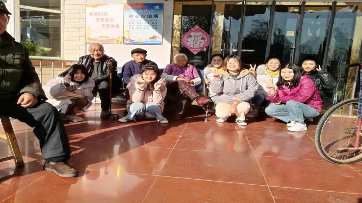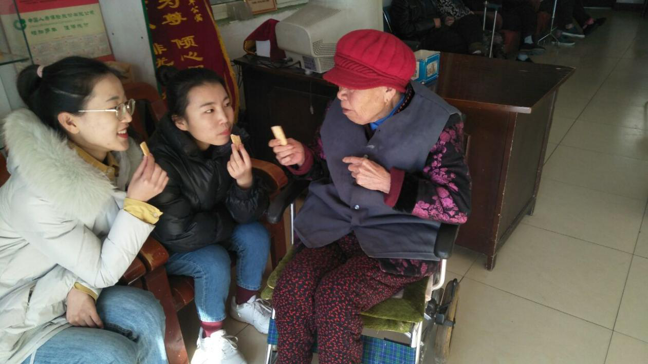 可能是第一次与陌生的长辈接触,各个部员都显得不知所措,不知道该如何面对老人们,该如何与他们沟通,。但是老人们仿佛看出了大家的心思,对于我们的语无伦次很宽容,反而安慰我们不需太紧张,随意就行。逐渐地,大家也不那么拘谨了,放松下来和老人们愉快地交谈起来。所涉及的话题从敬老院的居住环境,老人们的家庭背景,直至他们丰富的生活阅历,而我们也向老人们介绍了自己在大学的生活情况。通过互谈,我们了解到老人们的晚年生活并不寂寞,子孙们会时常带来各种礼品孝敬他们,许多学生志愿团队也来探望他们,社会各界也对老年人关心有加。尽管老人腿脚不便,但他临走时,老人还目送我们离去,更让我们倍受感动。老人们用他们辛劳的一生奉献给了子孙后辈,我们应让他们颐养天年。并且现在中国已处于老龄化社会,我们,作为新时代的大学生,作为他们的晚辈,更应去学会照顾尊重他们。