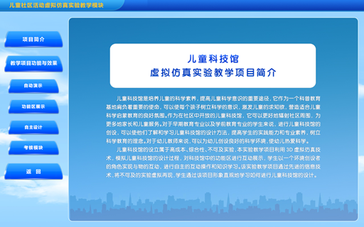 儿童科技馆的设立属于高成本、综合性、不可及实验,本实验教学项目利用3D虚拟仿真技术,模拟儿童科技馆的设计过程,对科技馆中的功能区进行互动展示,学生以一个环境创设者的角色实现与物的互动,进行自主的互动操作和知识学习。该实验教学项目通过先进的信息技术,将不可及的实验虚拟再现,学生通过该项目形象直观地学习如何进行儿童科技馆的设计。