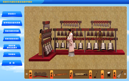 中国民族乐器的产生和发展以品种繁多、历史悠久且独具特色而闻名于世。它们不仅展示了中华民族的智慧和创造力,并且一直是人们精神生活中不可或缺的重要组成部分。民族乐器欣赏是指通过虚拟仿真实验教学使学生了解我国最经典民族乐器的演奏方法,掌握民族乐器的发展历程。它是面向学前教育专业、早期教育专业三年级学生开设的专业实验项目,是学生所学专业技能知识的拓展,对加强民族音乐文化教育、了解中国民族乐器博大精深的文化底蕴、拓展学生的知识领域有重要的意义。