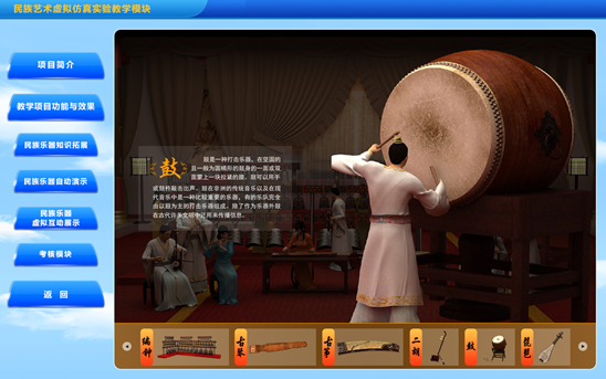 本实验系统主要包括民族乐器知识拓展、民族乐器自动演示、民族乐器虚拟互动展示、实验考核四大模块。下面对各个模块功能进行介绍: