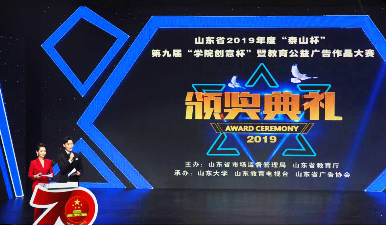 2019年10月23日下午2:30,在山东教育电视台隆重举办了山东省2019年度“泰山杯”第九届“学院创意杯”暨教育公益广告作品大赛颁奖典礼。此次“大赛”共征集了来自山东省各高校、广告企业、广告媒体的作品6090件,共评出获奖作品702件。大赛由山东省市场监管局、山东省教育厅主办,2019年度由山东大学、山东教育电视台、山东省广告协会承办。“泰山杯”“学院创意杯”暨教育公益广告作品大赛是一项具有导向性、示范性、广泛参与性的集体竞赛和创意活动,是山东省56万广告人的专业盛会,在业内具有极强的知名度、影响力。