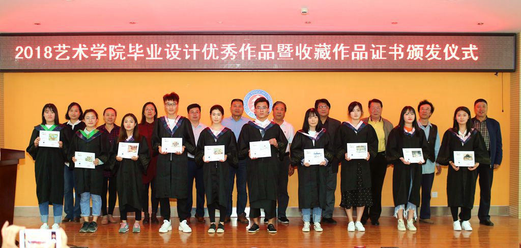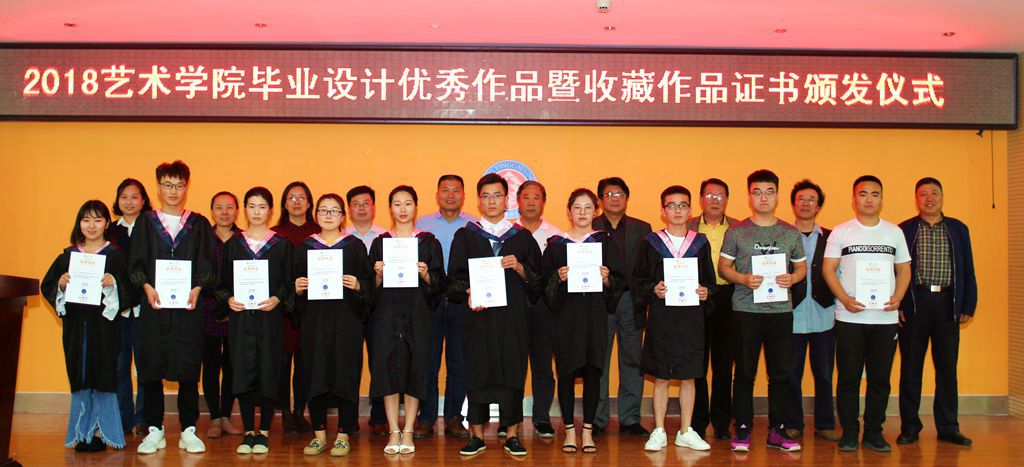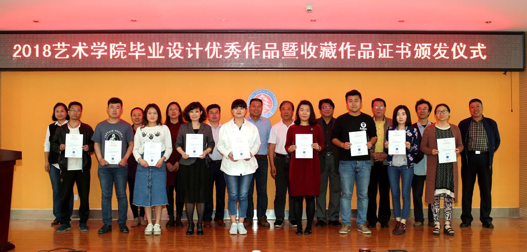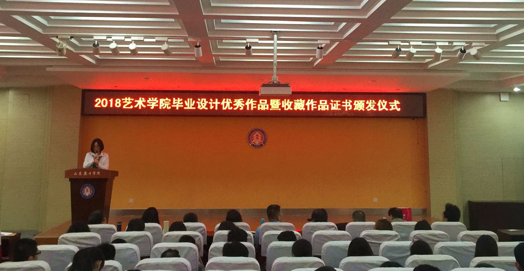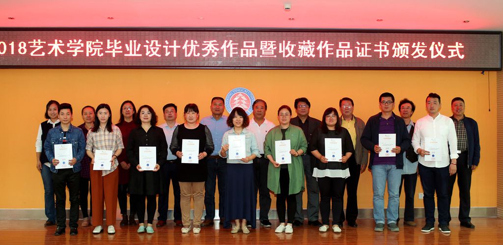 2018年5月8日下午, 2018届毕业设计优秀作品暨收藏作品证书颁发仪式在艺术楼报告厅隆重举行。艺术学院院长周长积教授、副院长朱于芝教授、张凯教授、党委副书记王志涛等学院领导、教授、老师和全体毕业生参加了仪式。仪式由朱于芝教授主持。