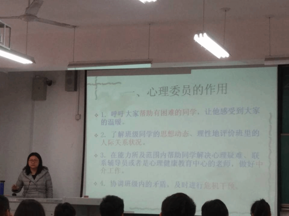 艺术学院辅导员赵婉莉老师为同学们讲述了“如何做好一名心理委员”。赵老师通过心理委员的作用、心理委员的工作原则、心理委员的工作职责、心理委员的素质要求、心理健康方面的知识、重点关注的群体、心理危机干预、十大常见心理求助快速解答等八个方面,向各班级心理委员展开培训。培训过程中赵老师明确的讲述了对于心理委员各方各面的要求:
