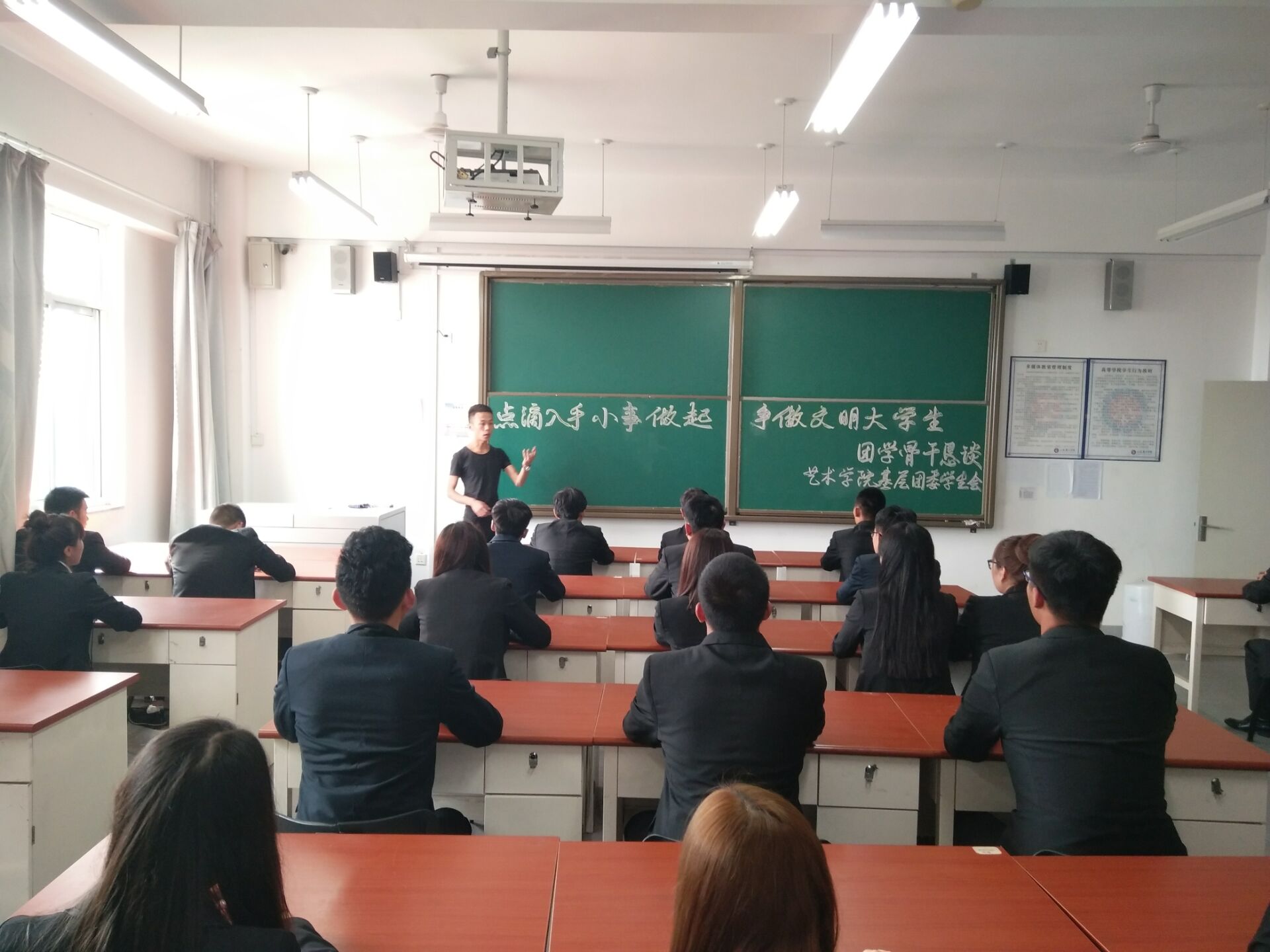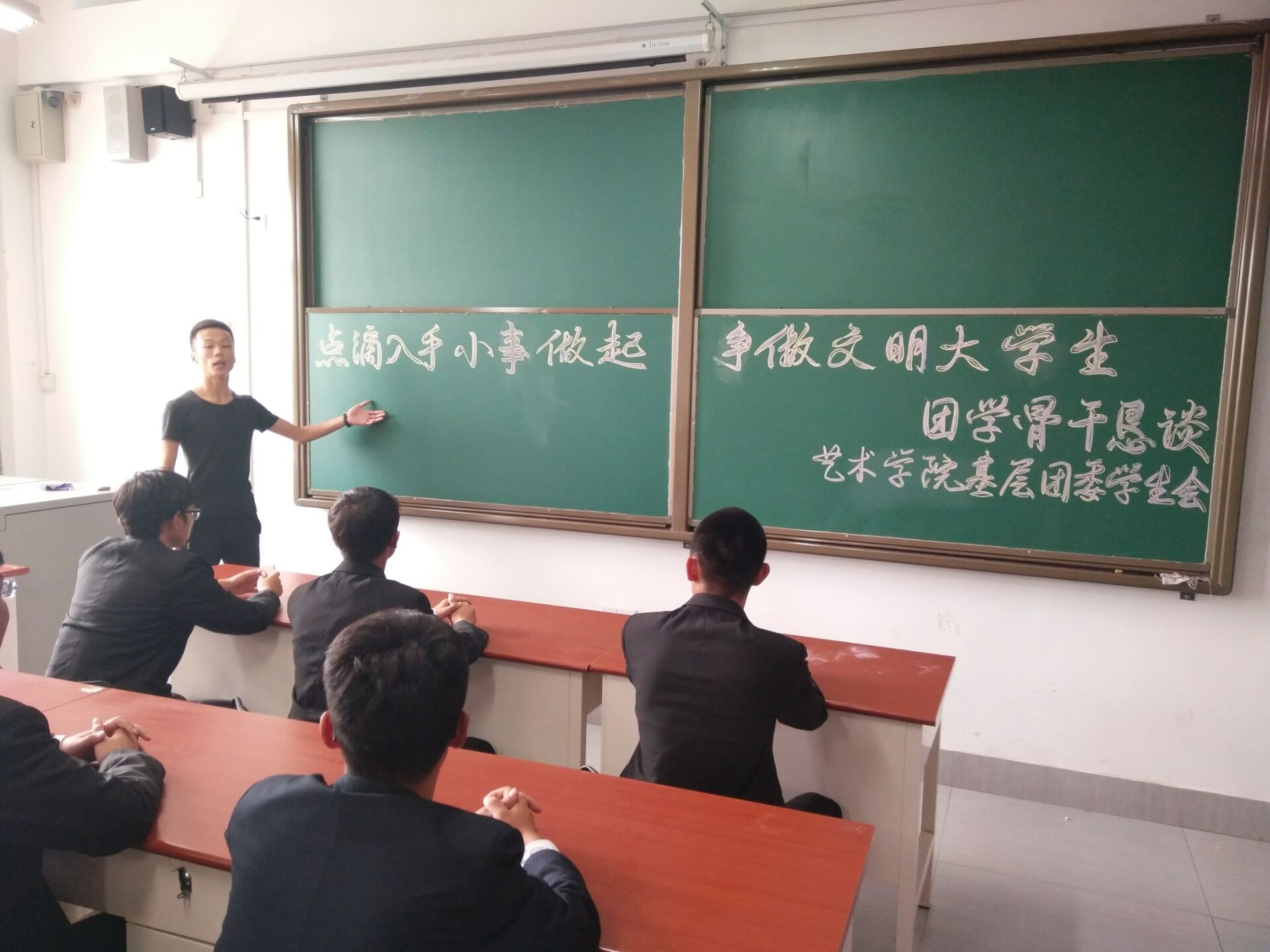 2016年9月23号在艺术学院艺术楼503教室进行了团学骨干恳谈会。会议伊始,学生会副主席鞠成龙就学校规章制度进行了强调,使学生进一步了解并熟知学校的有关规定,增强遵守校规校纪的自觉性,做一个文明的大学生。接着参加人员分成几个讨论小组,以“如何成为一名文明大学生”为主题展开讨论,结合当前大学生的实际状况,以及学校的文化建设和社会发展对人才的需求等方面进行了热烈的讨论和分析;对于“文明大学生”的看法同学们各抒己见,也从不同方面提出了“学会学习、学会做人、学会生存”等的新观点。最后,鞠成龙进行了会议总结,要加大对大学生的校规校纪教育,引导学生树立理想、坚定信念、刻苦学习,追求和谐的人生,倡导和谐的生活学习环境和浓厚优良学风,塑造高尚的道德情操和奋发进取的良好精神风貌。