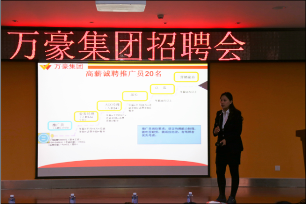 招聘会开始,主讲人力资源部部长王丽娟对万豪集团进行了简单介绍,并播放了一个宣传片,其内容涵盖公司简介:总部坐落于山东济南,是国家级重点高新技术企业及山东重点骨干民营企业,集团一贯遵循“尊重知识,尊重人才”的宗旨,尊重公司的每一位员工,没有科学,公平的考核评价制度,从制度上保证人才脱颖而出。之后,王部长还生动对万豪集团作了详细介绍,在场学生们了解到万豪集团为回报社会,打造绿色低碳,循环经济产业集群,搭建起及育种、科技、农药、肥料、物流为一体的大科技、大产出、大服务、大营销体系。集团自15年后开始回报社会,赞助给山东农业大学500万建校史馆并为学生设立了奖助学金。现公司占地500亩,总资产约10亿。科研成果:先后获得了国家实用新型专利8个,公司农药先后获得多项奖项。接下来,王部长还对公司福利等相关事宜向学生作了详细介绍:有五险一金,免费标间宿舍,节日福利,公司省外旅游,年会聚餐等。接下来对本次的招聘岗位薪水及人数做了详细的介绍。此次招聘会,为艺术学院应届毕业生提供了丰富的、有良好前景的岗位,主要有总经理助理,计划员,技术员等等,后期表现优秀可升职为集团的中高层管理人员,给员工们提供了一个有潜力的升值空间。最后,公司还进行了现场面试,对在校实习生进行了筛选,面试结果将以邮箱方式通知学生。