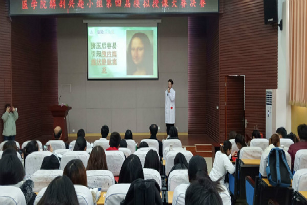 活动伊始,大屏幕上放映了体现解剖小组和谐大家庭的视频剪辑,由此活动拉开序幕。随之,主持人周晓悦介绍了出席本次大赛的评委老师以及参赛选手。莅临本次大赛的有医学院院长卢传华、张薇薇、姜自绘、国承亮、徐莉、孙权等老师和60余位解剖小组人员。经过了初赛、复赛,半决赛三轮比赛六位选手脱颖而出,进入了此次决赛。