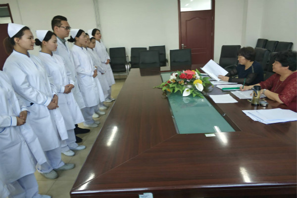 面试初,15、16级面试学生整齐地穿戴好护士服,首先他们将自己准备好的简历递给了面试官,随着又进行了三分钟的自我介绍以及陈述了自己的专业能力、突出表现及实践经历。其次,面试老师就学生的不同情况针对性地向部分学生提出了一些实际问题,医学院学生结合自身情况和客观实际严谨地回应了考官的提问。最后,山东省立医院两位主任考官对此次面试做出了高度评价,赞扬了医学院英才辈出,人才济济;此次面试也充分体现出了医学院学生自信向上的精神面貌。