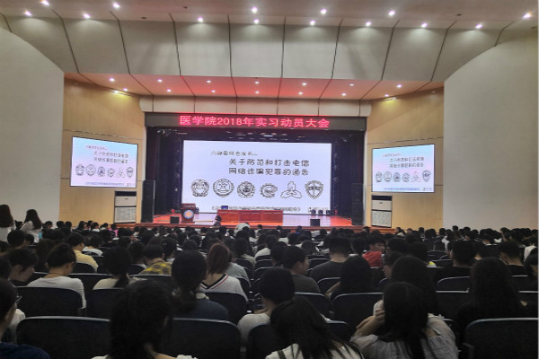613日下午,医学于南校区大学生活动中心召开了2018实习动员大会。医学院院长卢传华教授、外国语学院付廷真副院长、医学院于志芳副院长、教学秘书王世芳、就业秘书谭道海、全体辅导员和2018实习生参加了此次大会,会议由于志芳副院长主持。